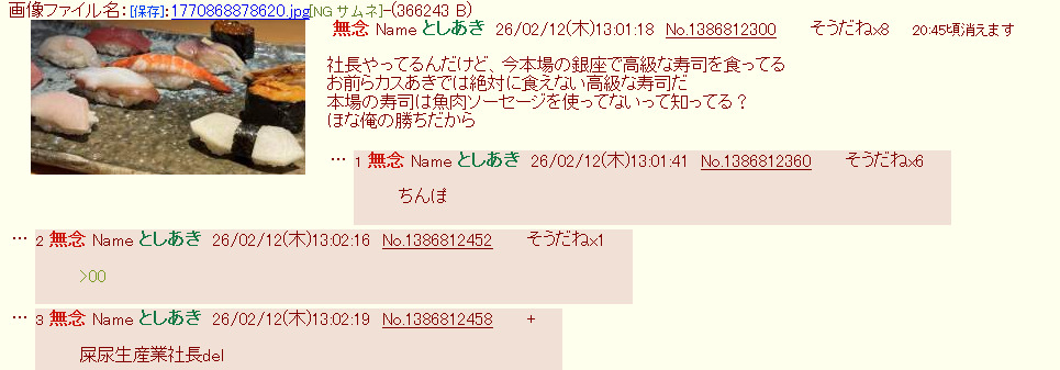 | … | 5無念Nameとしあき26/02/13(金)12:13:19No.1387031036そうだねx5おまえが今まで食ってた寿司はカマボコ乗ってたのかドブえもん… |