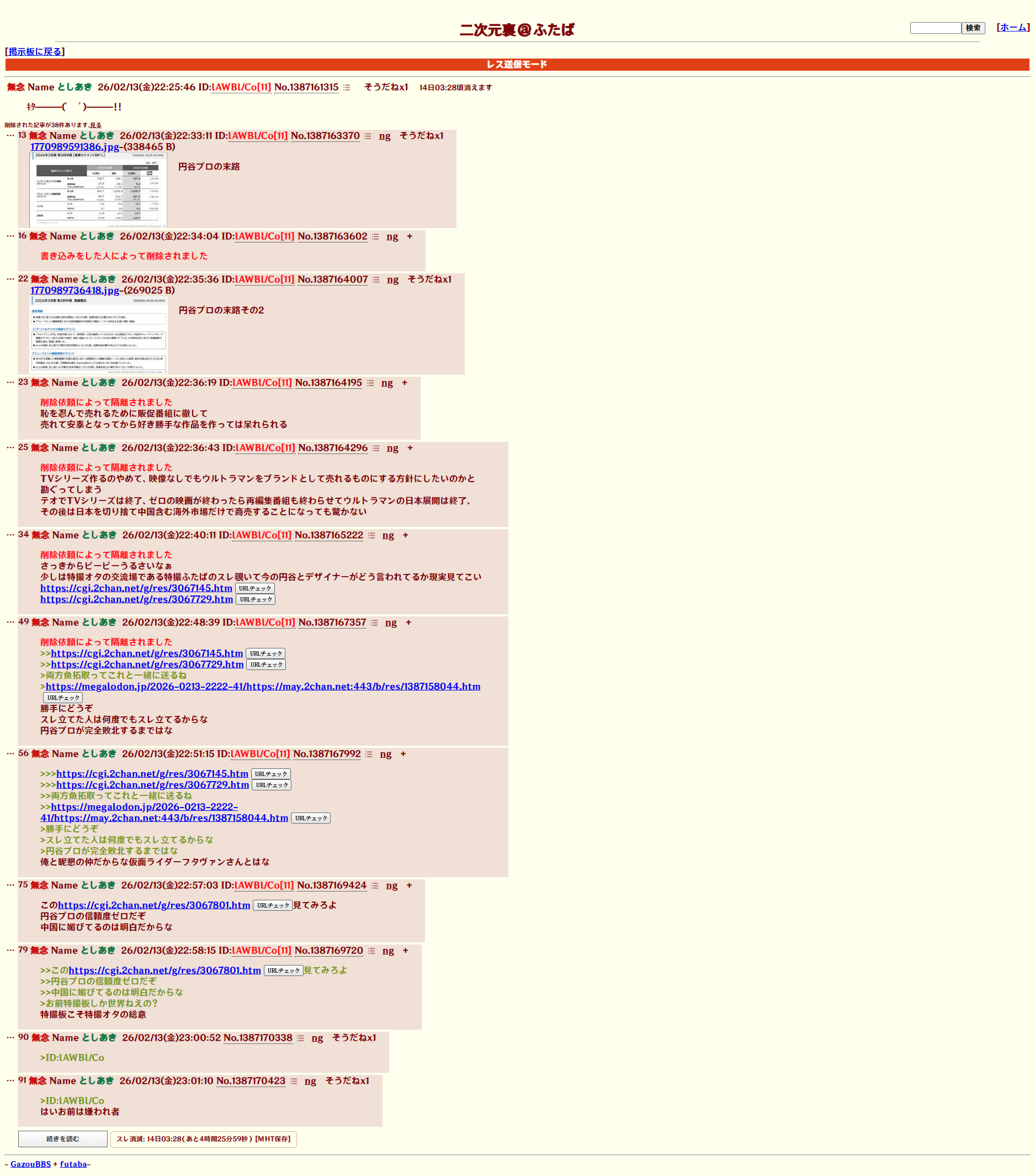 | … | 88無念Nameとしあき26/02/13(金)23:00:32No.1387170256+>特撮板こそ特撮オタの総意 |