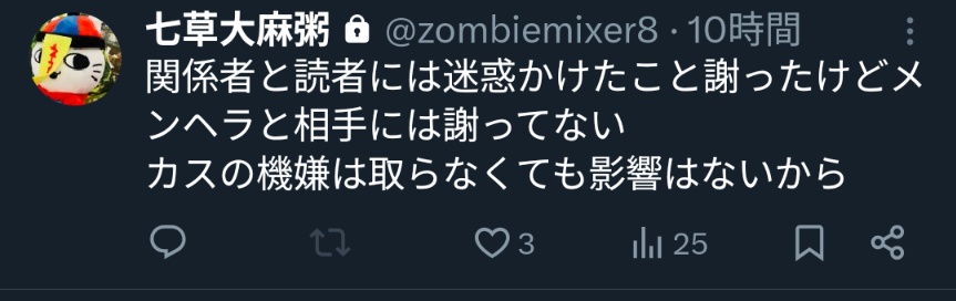 | … | 58無念Nameとしあき26/02/14(土)00:29:25No.1387189936そうだねx2七草のポストだと自分が迷惑かけた自覚あるんじゃん |