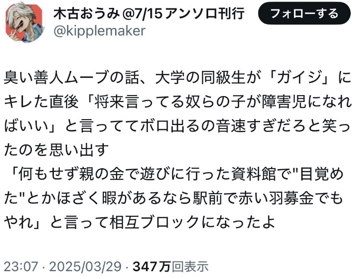 | … | 31無念Nameとしあき26/02/14(土)00:17:22No.1387187738そうだねx3ATM発言とゲイの友達欲しい発言だけで戦えると思ってるのが |