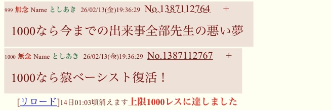 | … | 955無念Nameとしあき26/02/14(土)03:25:45No.1387208016+裁判が虚言でありますように |