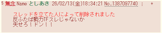 | … | 42無念Nameとしあき26/02/14(土)08:00:28 ID:tWeE9CO6No.1387222791+書き込みをした人によって削除されました |