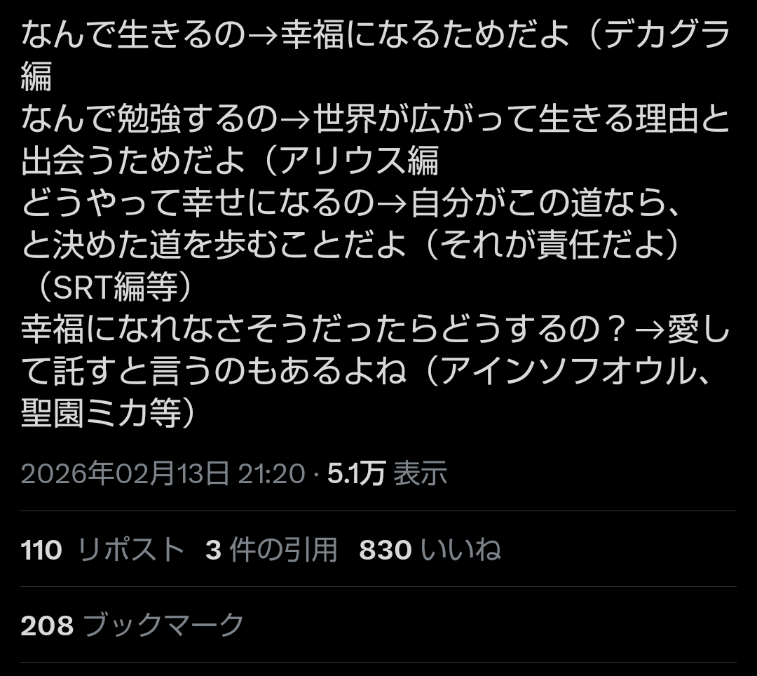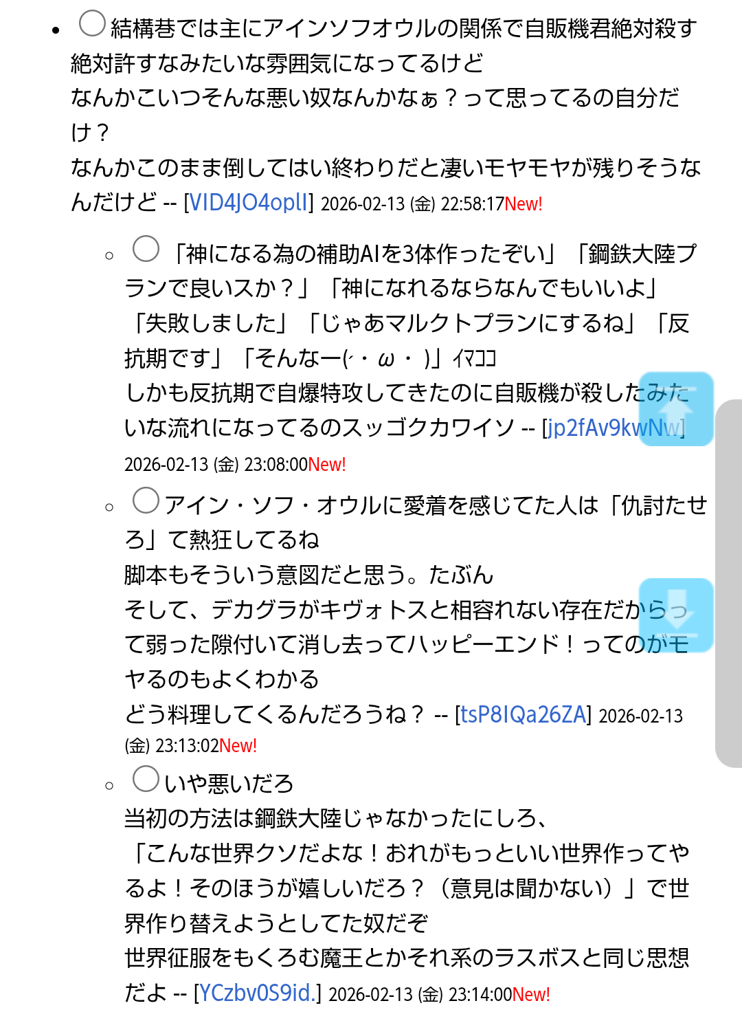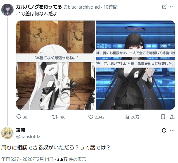 | … | 839無念Nameとしあき26/02/14(土)14:15:52No.1387292217そうだねx1>>あにまんだと本当に同じシナリオ読んだのか不安になる連中の擁護激しいね |