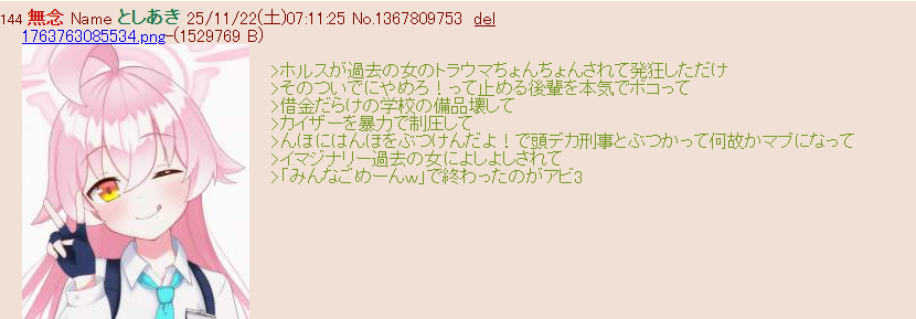 | … | 873無念Nameとしあき26/02/14(土)14:28:26No.1387294656+>今ホロライブの人がウマ実況してるけどブルアカはアニバなのにVの人はノータッチなの? |