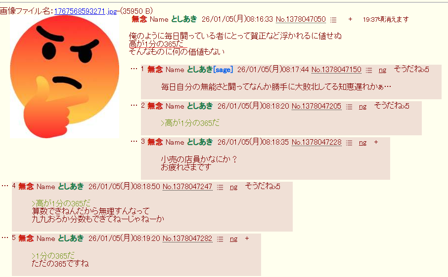 | … | 90無念Nameとしあき26/02/14(土)09:50:58No.1387237941そうだねx3>スレ豚くんはまず九九が出来るように努力しないとな |