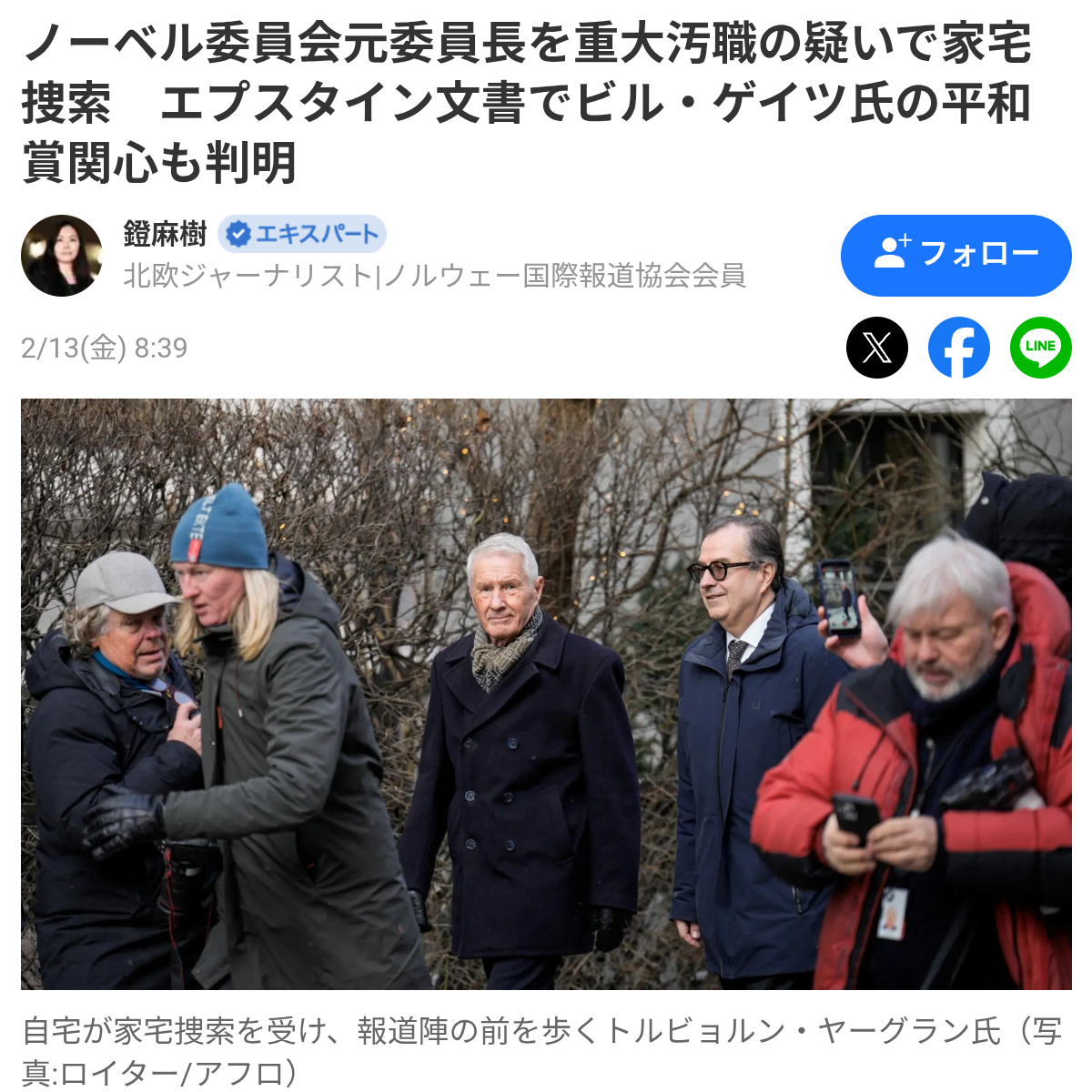 | … | 56無念Nameとしあき26/02/14(土)15:01:56No.1387300994+2013年3月にエプスタインがゲイツとともに、フランスのストラスブールにある当時のノーベル委員会(Nobel Committee )の委員長、トルビョーン・ヤーグランド(Thorbjørn Jagland)の自宅に行った |