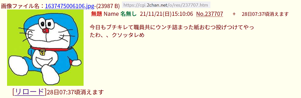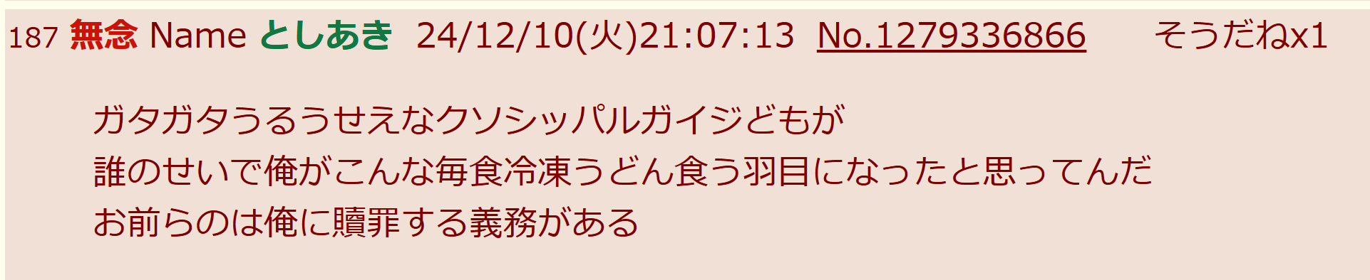 | … | 27無念Nameとしあき26/02/14(土)17:27:04No.1387331940そうだねx8>ごちゃごちゃぬかしてるとてめぇらん家に下痢便パンパース投げ込むぞコラ |