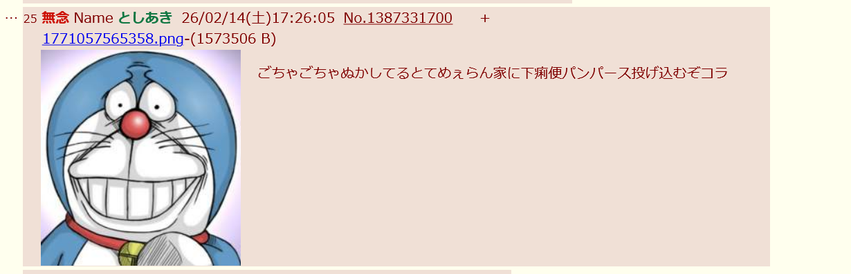 | … | 28無念Nameとしあき26/02/14(土)17:27:24No.1387332015そうだねx3>ごちゃごちゃぬかしてるとてめぇらん家に下痢便パンパース投げ込むぞコラ |