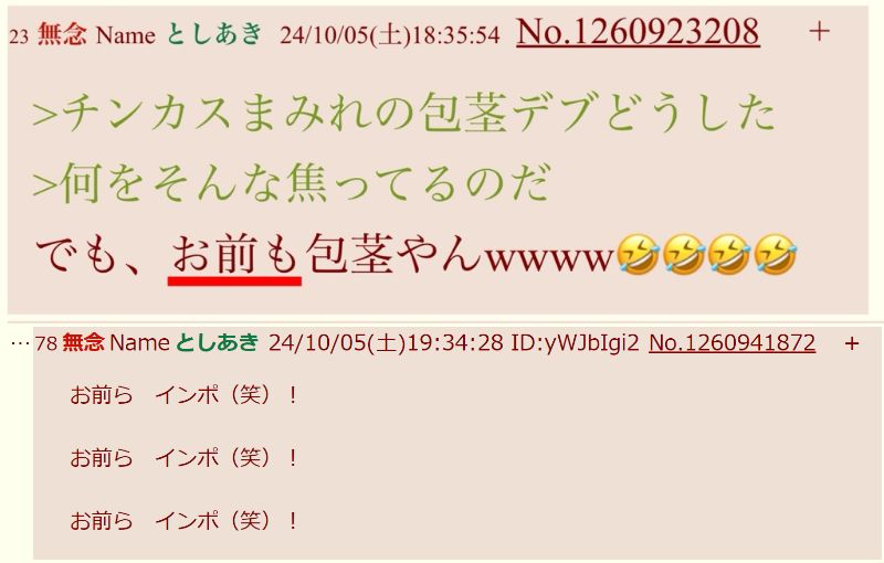| … | 59無念Nameとしあき26/02/14(土)17:46:36No.1387336568+>今までずっとママに漏らしたウンコ拭いてもらいながら潰すぞクソガキ!とか書き込んでたの? |