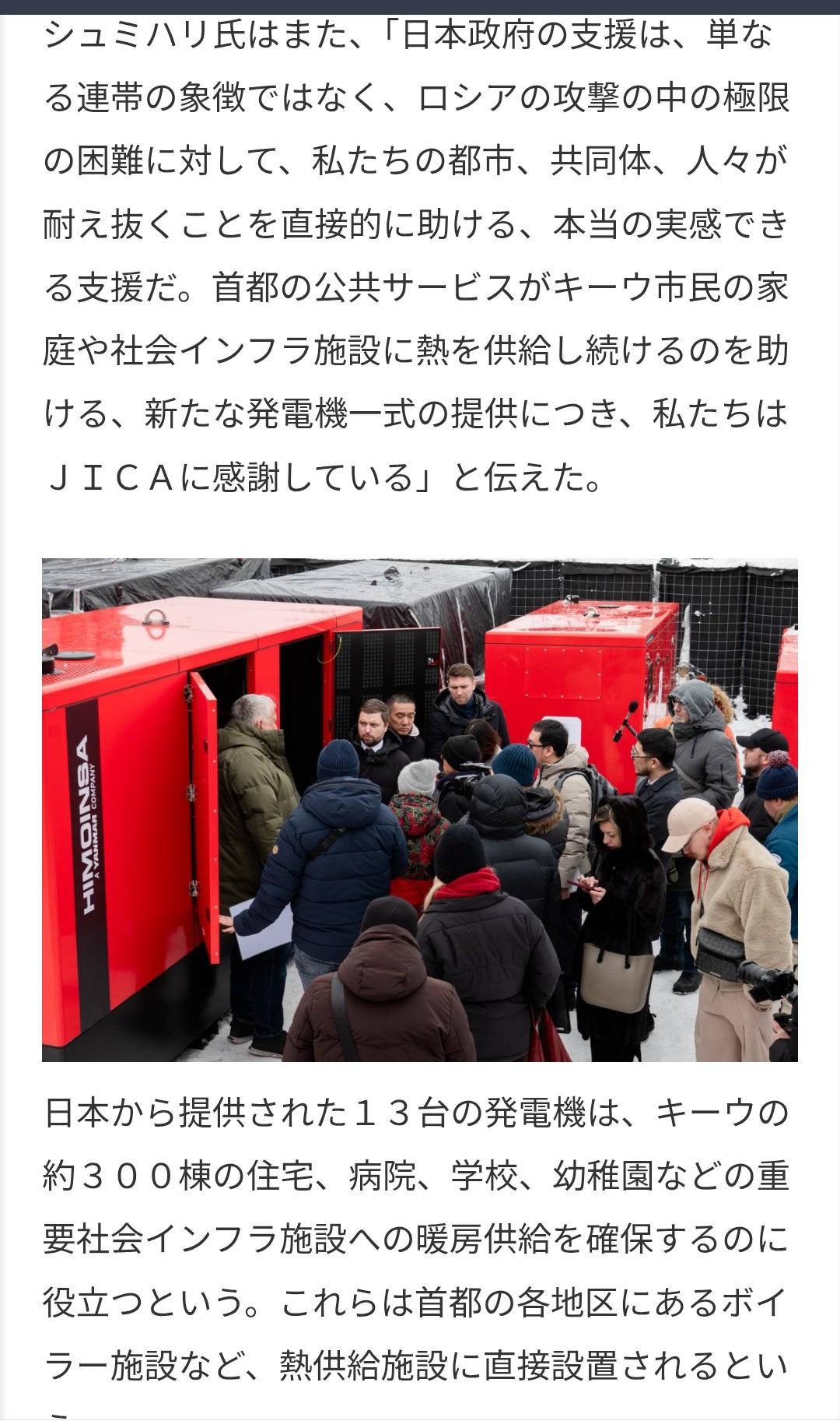 | … | 33無念Nameとしあき26/02/14(土)23:04:04No.1387432193そうだねx10 1771077844942.jpg-(389662 B) ロシアのウクライナのインフラ破壊に対抗して日本から大型発電機を追加支援 |