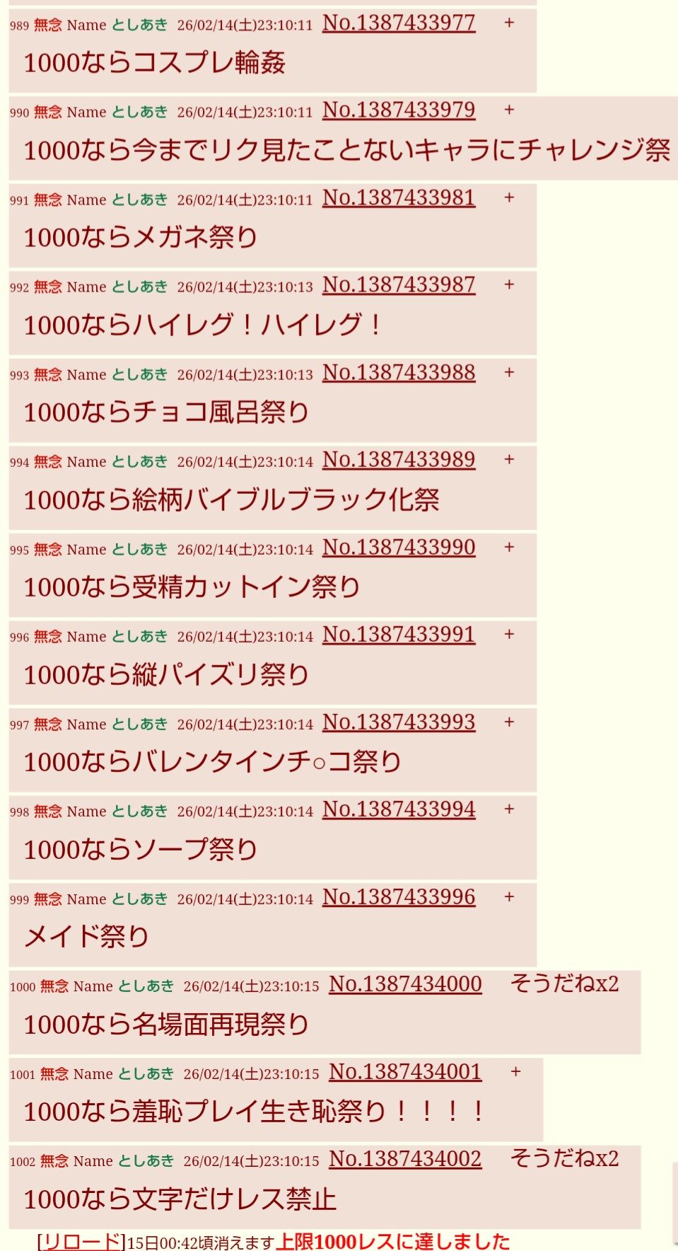 | … | 369無念Nameとしあき26/02/15(日)00:16:05No.1387450658+>もう15日になっちゃったけどどうぞ |