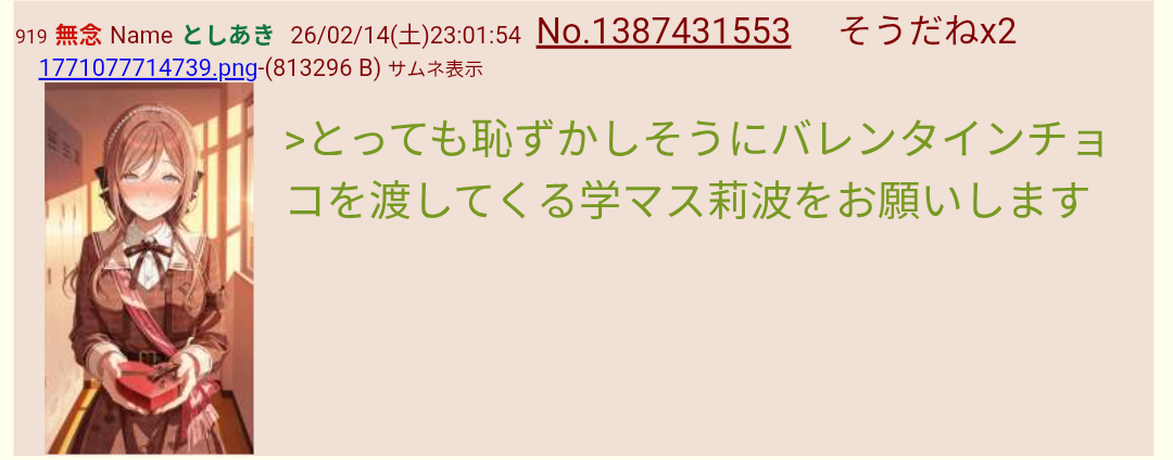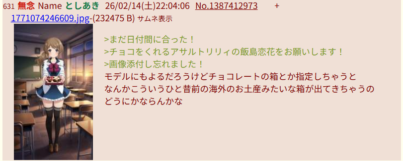 | … | 352無念Nameとしあき26/02/15(日)00:11:59No.1387449725そうだねx1 1771081919936.png-(1226178 B) >版権オリエロ非エロ関係なく生成あきの性癖ドストライクな子からチョコをもらう想い出のシーンをお願いします |
