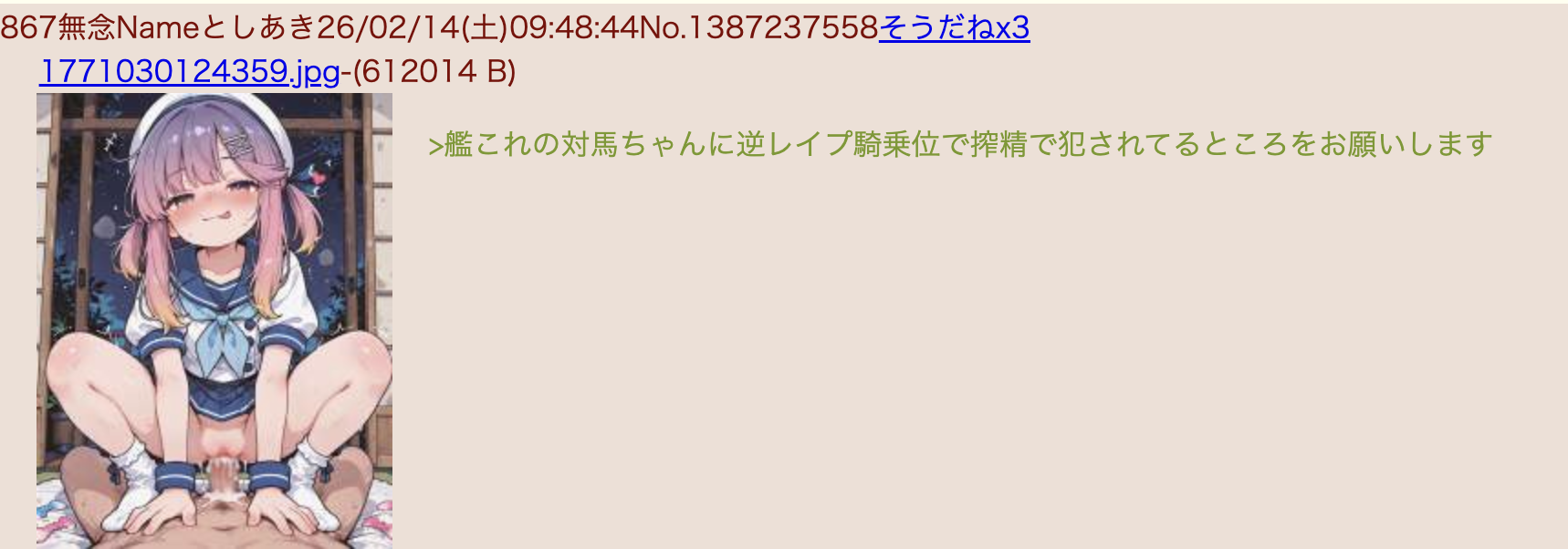 | … | 75無念Nameとしあき26/02/14(土)23:21:23No.1387437082+ 1771078883164.png-(217581 B) 自宅で口塞がれながらレイプ中出しされて受精してしまうガルパンの武部沙織をお願いします |