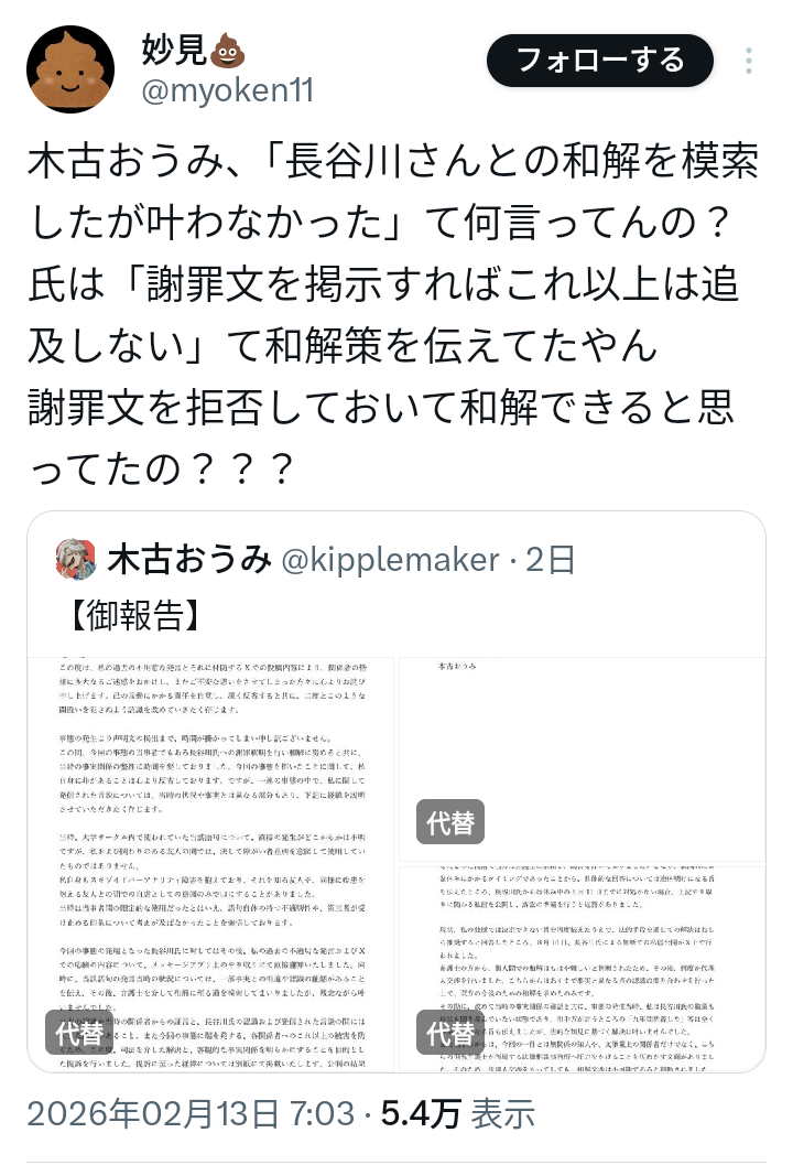 | … | 34無念Nameとしあき26/02/14(土)23:24:23No.1387437890そうだねx3>まじでなんで擁護する人が一人も出てこないの |