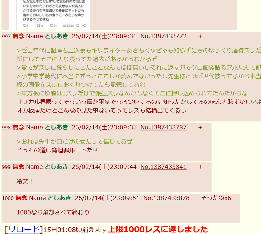 | … | 442無念Nameとしあき26/02/15(日)00:32:15No.1387454384+先生はまあ普通の人だよね… |