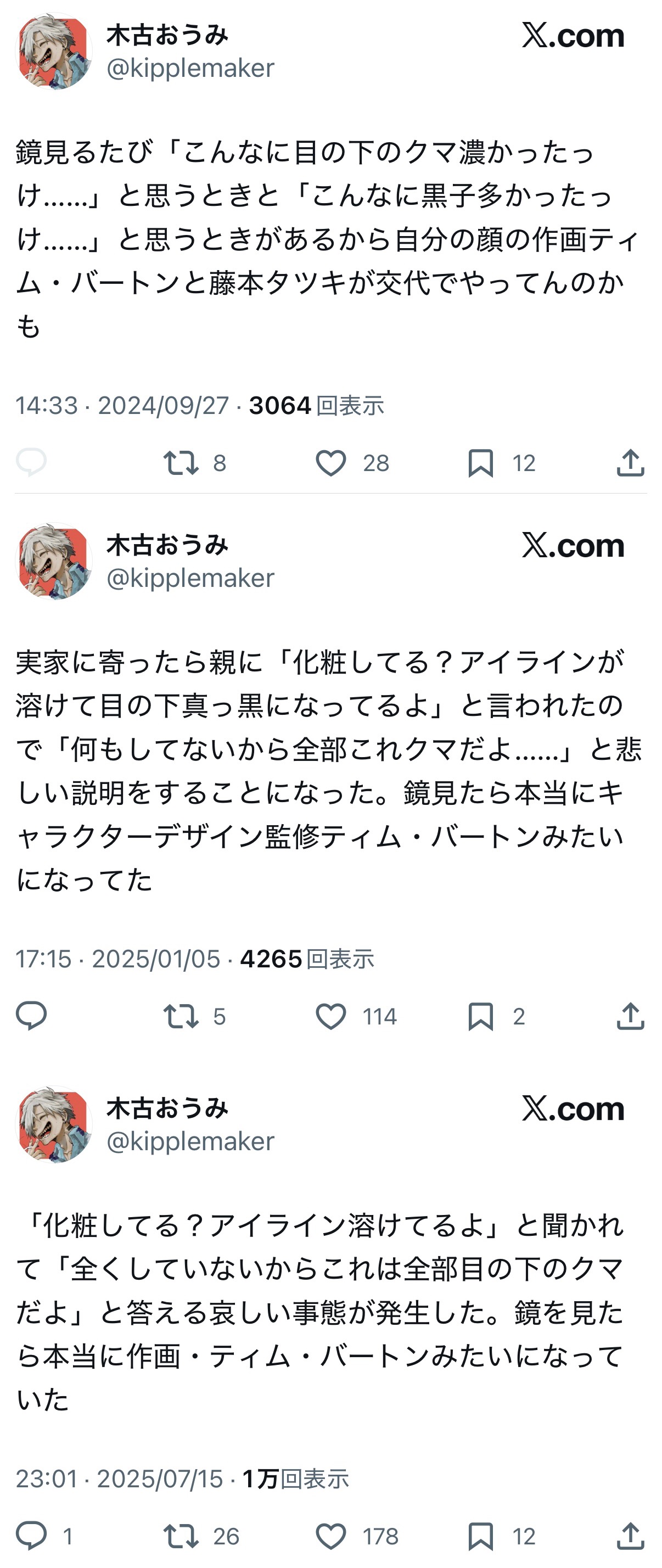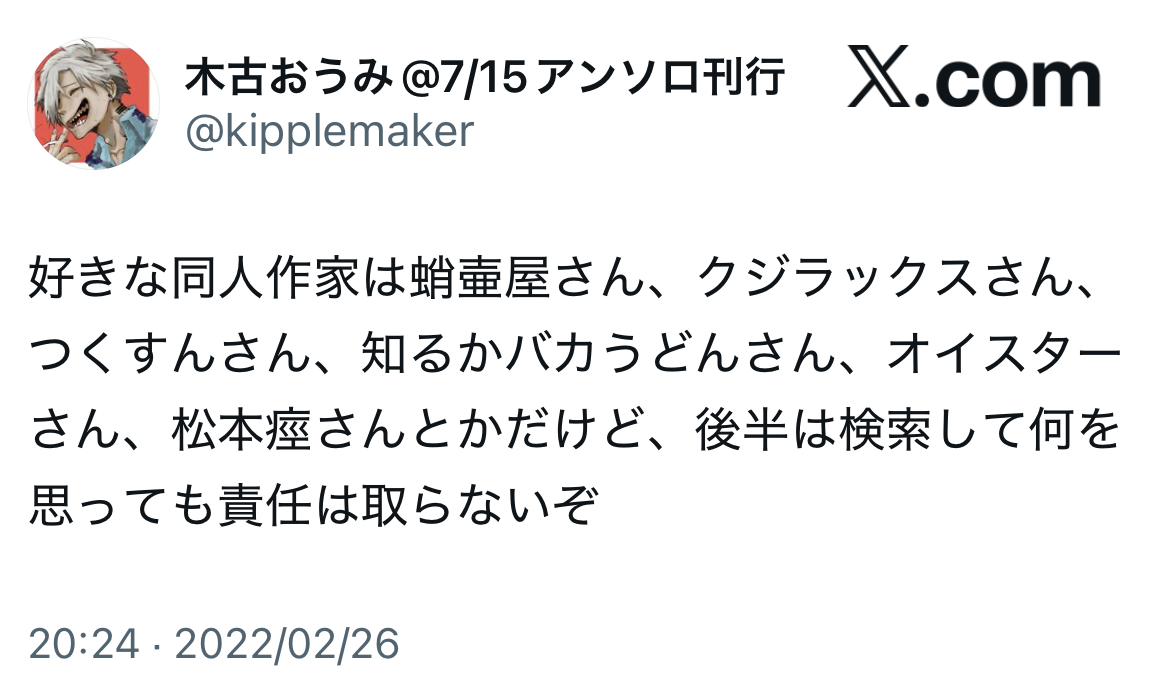 | … | 395無念Nameとしあき26/02/15(日)00:23:27No.1387452277+>創作者に限ればスキゾイド的なSNS運用してるのはそれこそ藤本タツキとかだよ |
