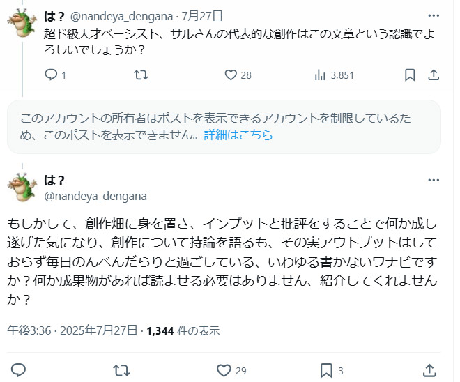 | … | 402無念Nameとしあき26/02/15(日)00:25:17No.1387452703+本当にセンスのある文章って大概簡潔だし |