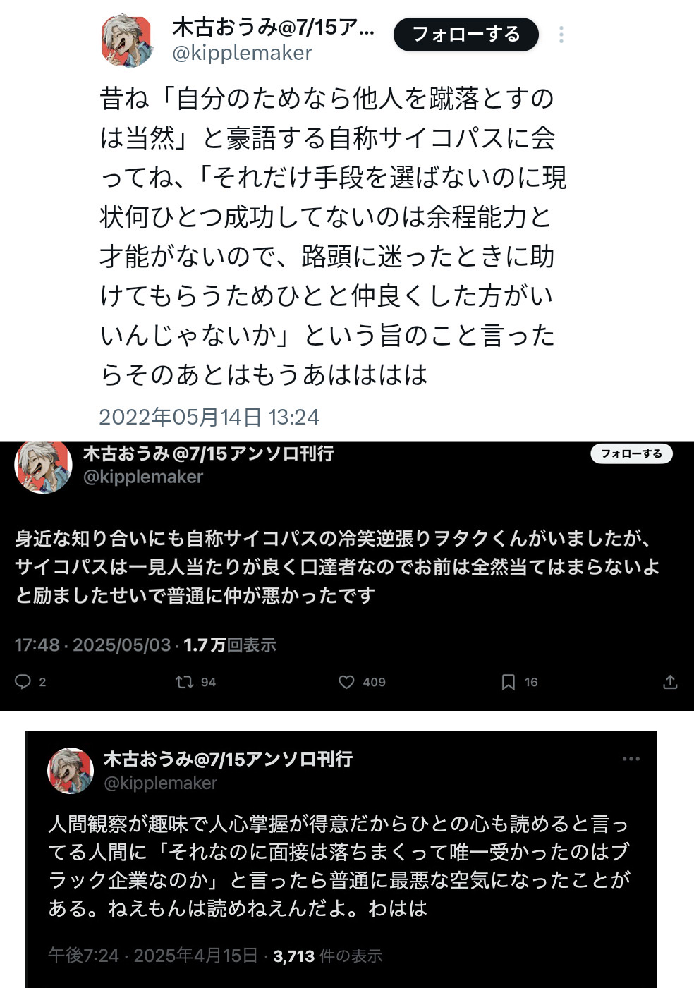 | … | 408無念Nameとしあき26/02/15(日)00:27:35No.1387453289そうだねx1つかシンプルにシゾイドをサイコパスかなんかと勘違いしてる気もするんだよな |