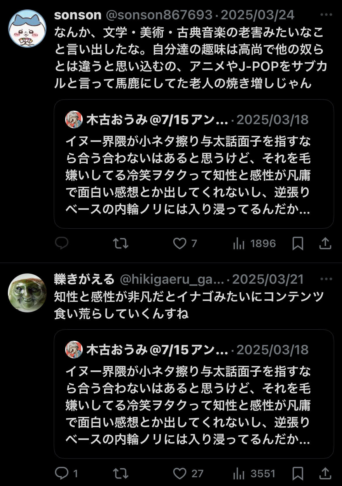 | … | 428無念Nameとしあき26/02/15(日)00:29:58No.1387453848+倫理とか品性置いといてもちょいバズしたネタポストの使い回しは余りにもダサ過ぎてやってもないのに共感性羞恥覚えてしまう |