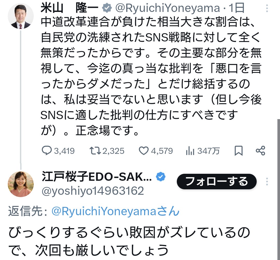 | … | 936無念Nameとしあき26/02/15(日)09:07:19No.1387507208+批判のせいで負けたって中道議員のどこが口汚いんだって憤ってた人居たけけどもしかして支持層の口汚さを言われてるのに気づいていない…? |