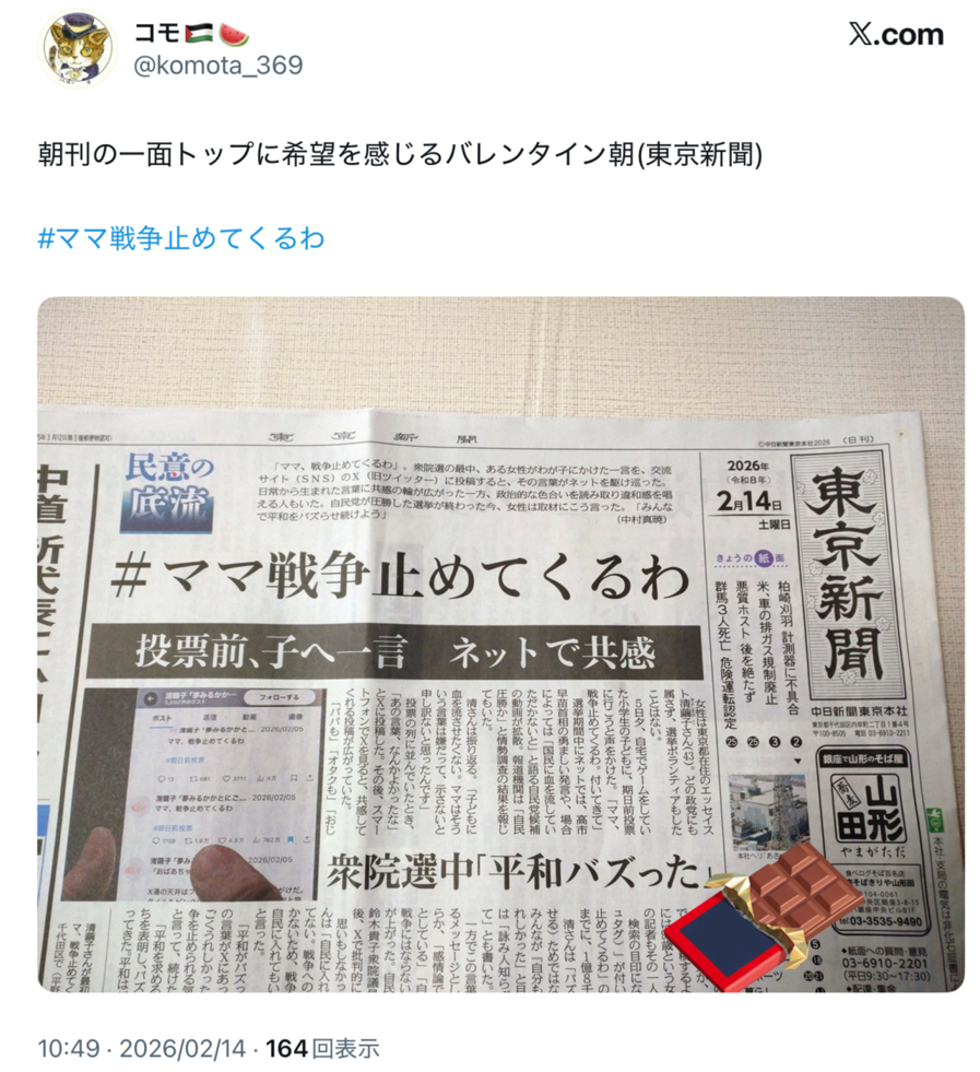 | … | 979無念Nameとしあき26/02/15(日)09:11:44No.1387508111+>そんな中昨日の東京新聞が一面でママ戦争を止めてくるを取り上げてて笑っちった |
