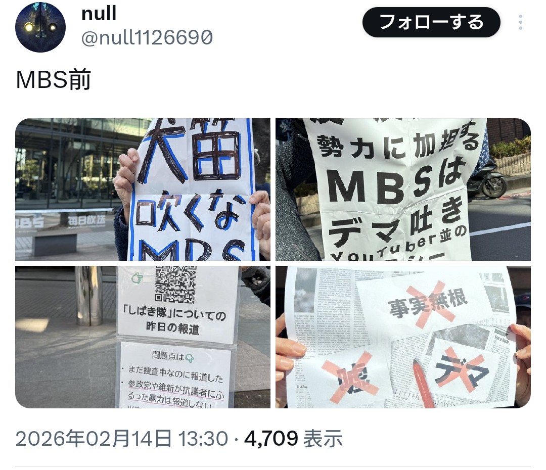 | … | 89無念Nameとしあき26/02/15(日)08:10:38No.1387497403+MBSは参政党や自民・維新相手の暴行ならセーフの認識だから |
