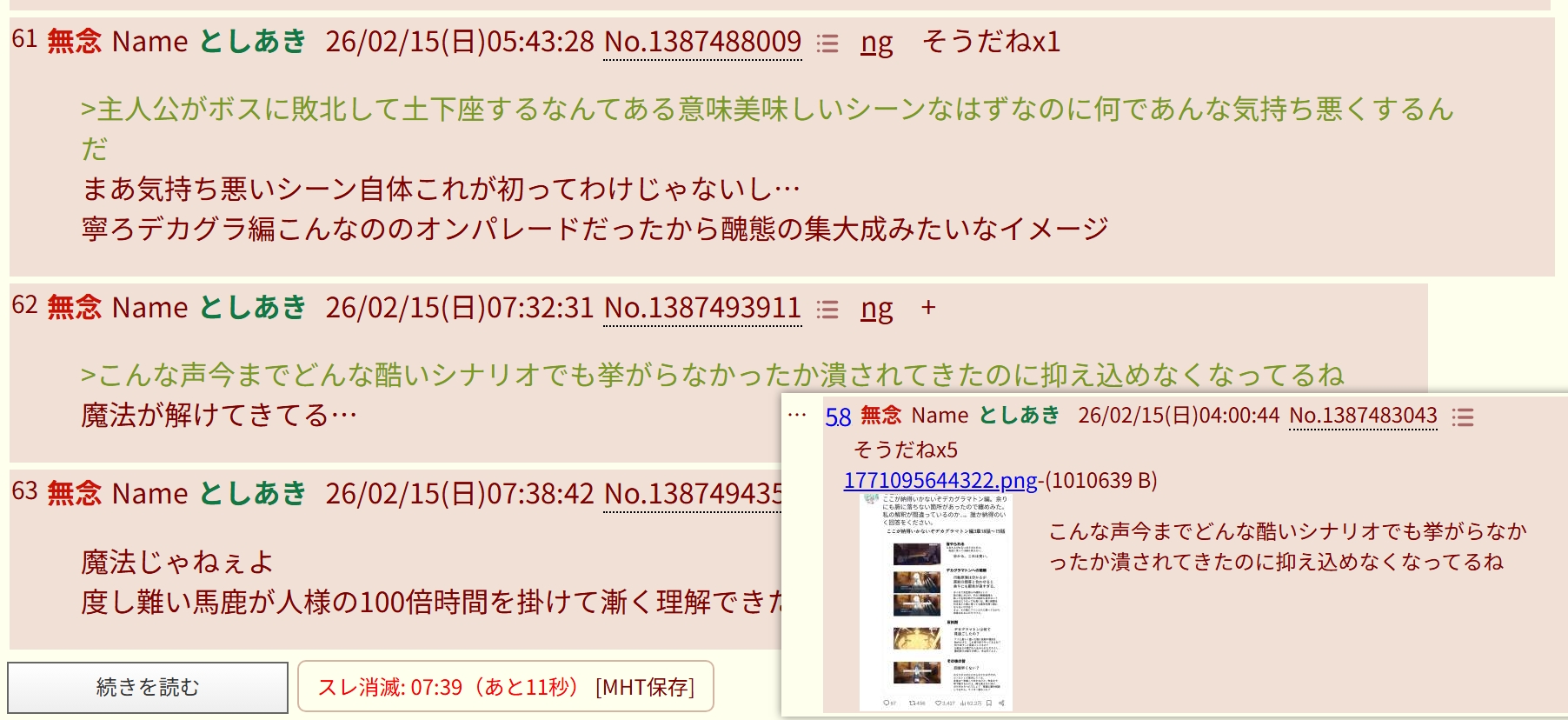 | … | 4無念Nameとしあき26/02/15(日)06:08:26No.1387488989そうだねx4 1771103306918.jpg-(75001 B) >立て乙わよ |
