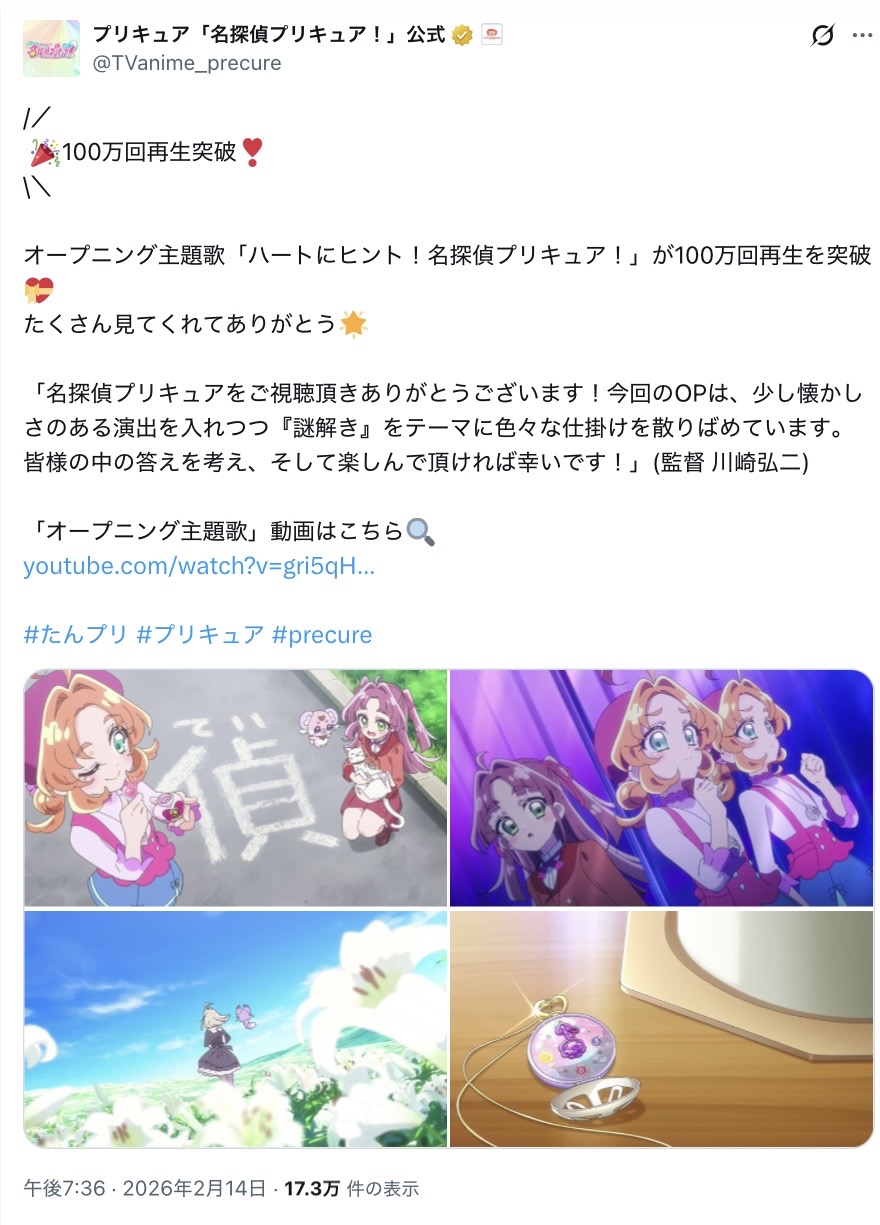 | … | 2無念Nameとしあき26/02/15(日)06:46:55No.1387490893+ 1771105615790.jpg-(217431 B) OPで100万再生突破!とかやってるのプリキュアではじめてみた…気がする |
