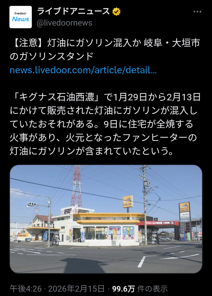 | … | 92無念Nameとしあき26/02/15(日)20:51:18No.1387683860+>店の人間とローリーの人間がそれぞれミスって灯油のとこへガソリン入れたって事?? |