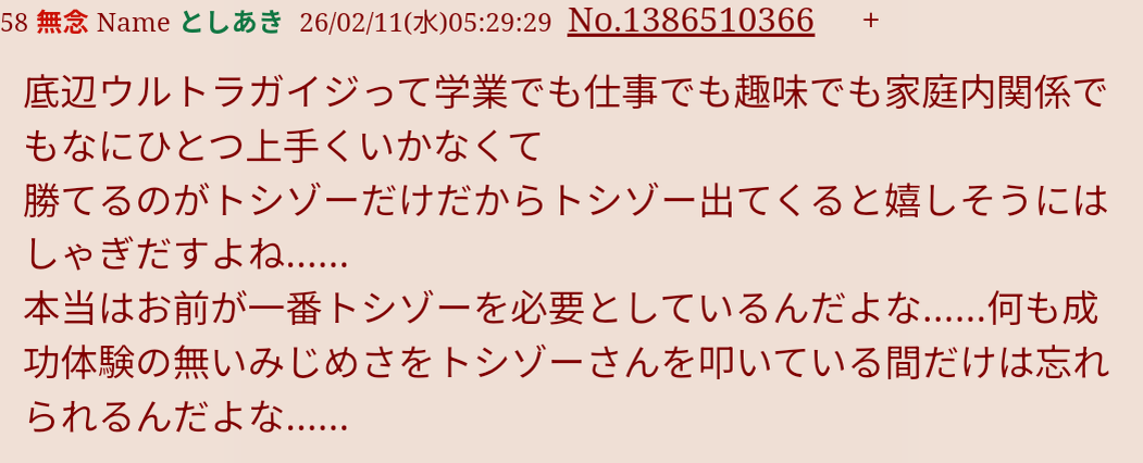 | … | 226無念Nameとしあき26/02/16(月)02:30:16No.1387756284+情けないねえ |