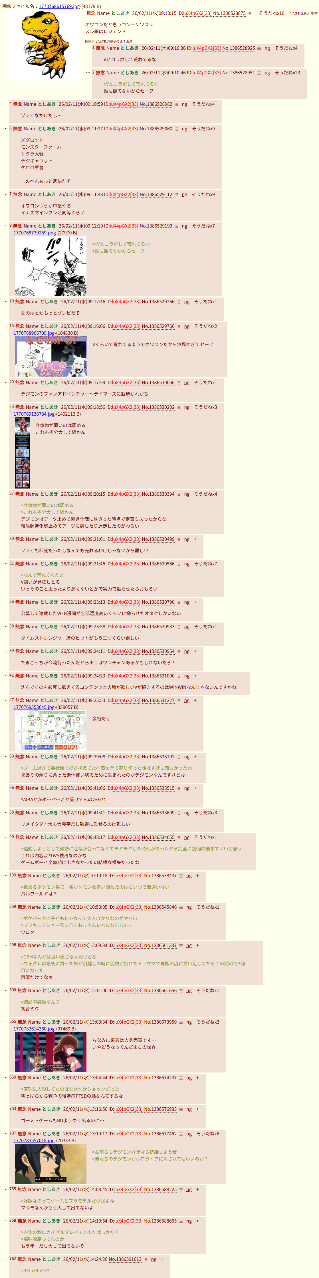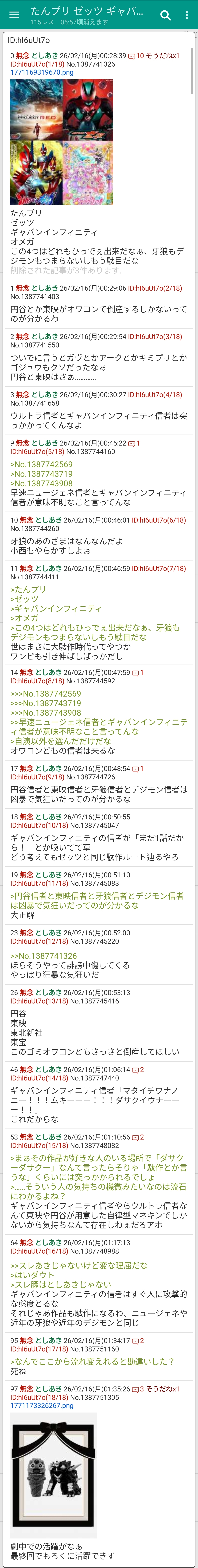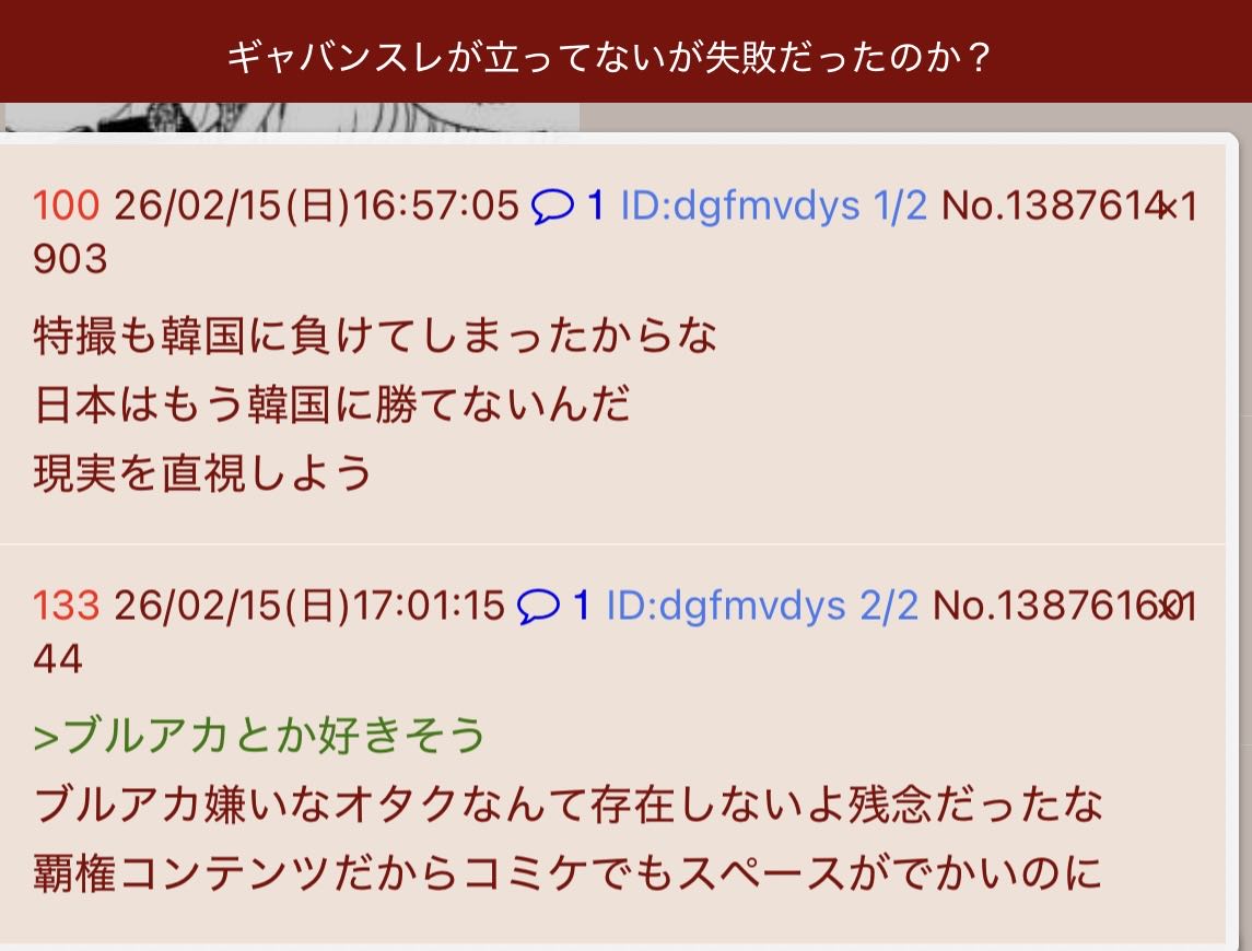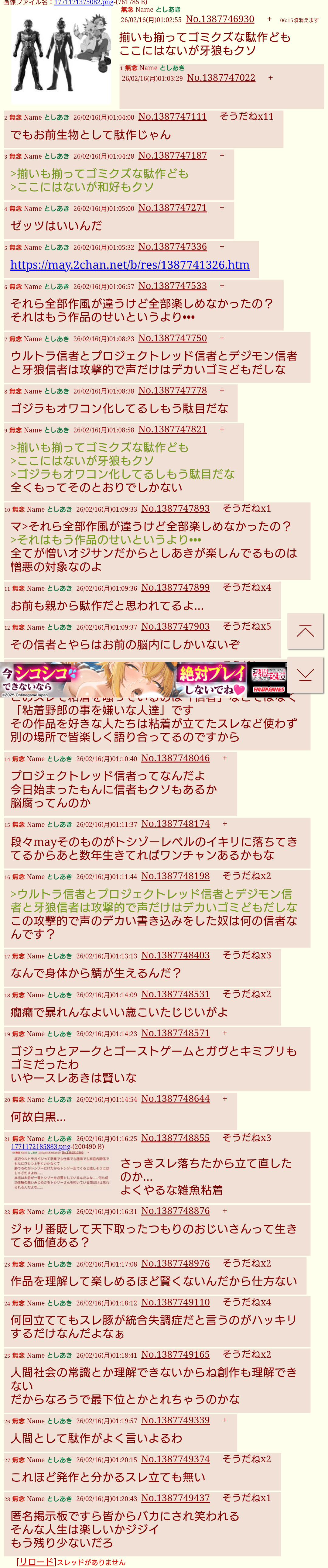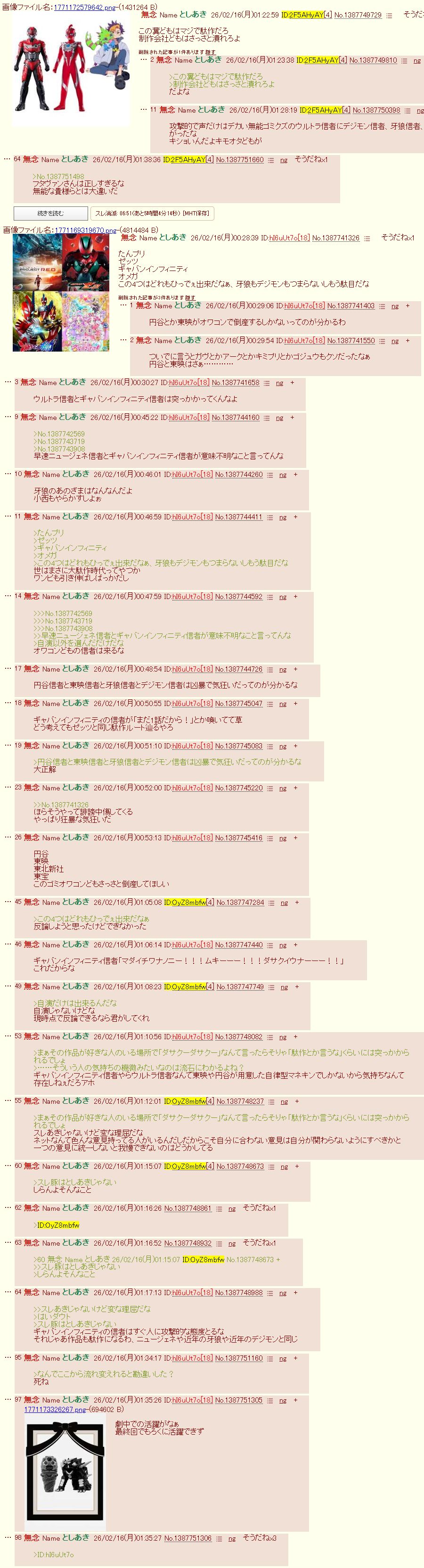 | … | 19無念Nameとしあき26/02/16(月)00:51:10 ID:hI6uUt7oNo.1387745083+>円谷信者と東映信者と牙狼信者とデジモン信者は凶暴で気狂いだってのが分かるな |