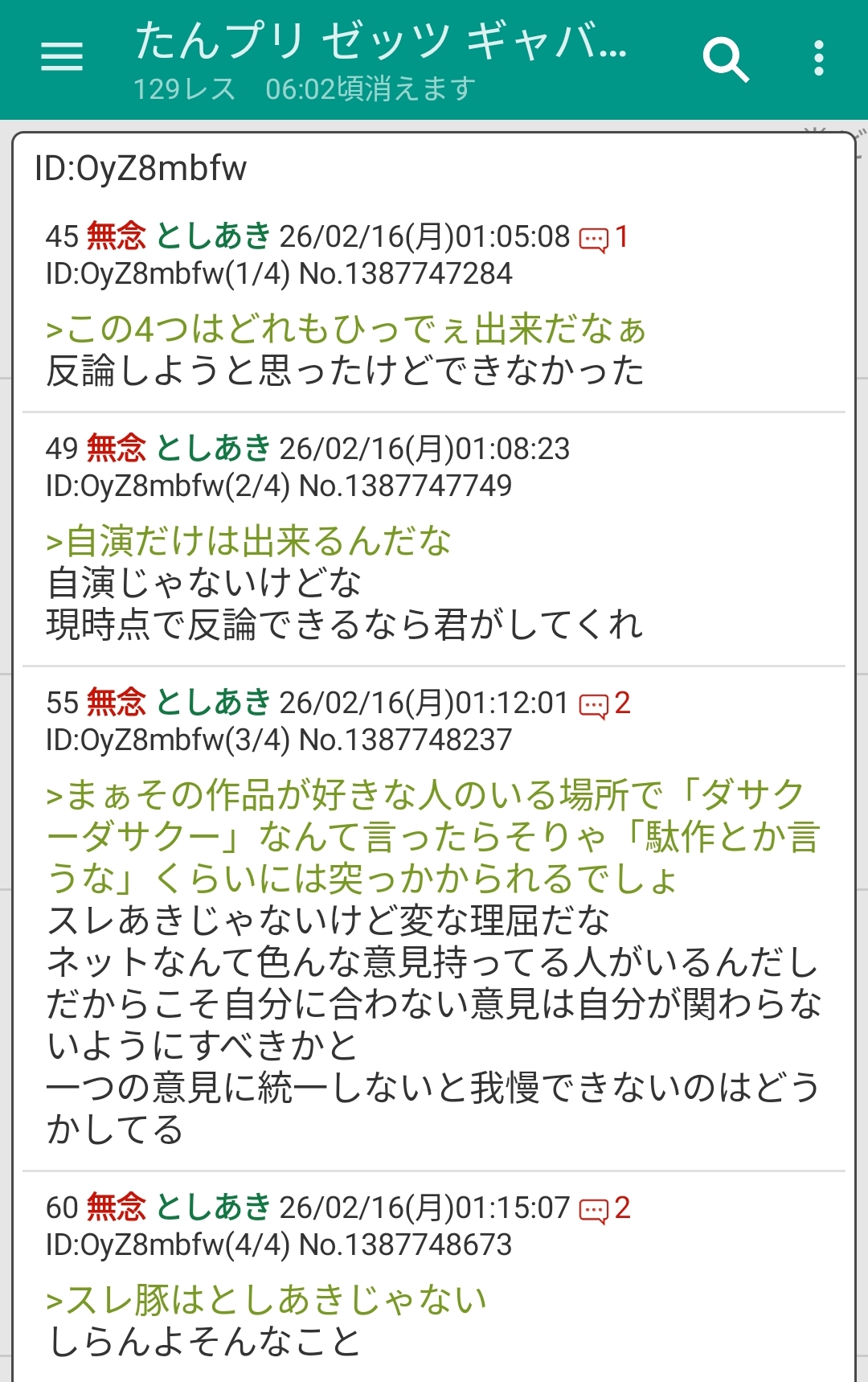 | … | 49無念Nameとしあき26/02/16(月)01:08:23 ID:OyZ8mbfwNo.1387747749+>自演だけは出来るんだな |