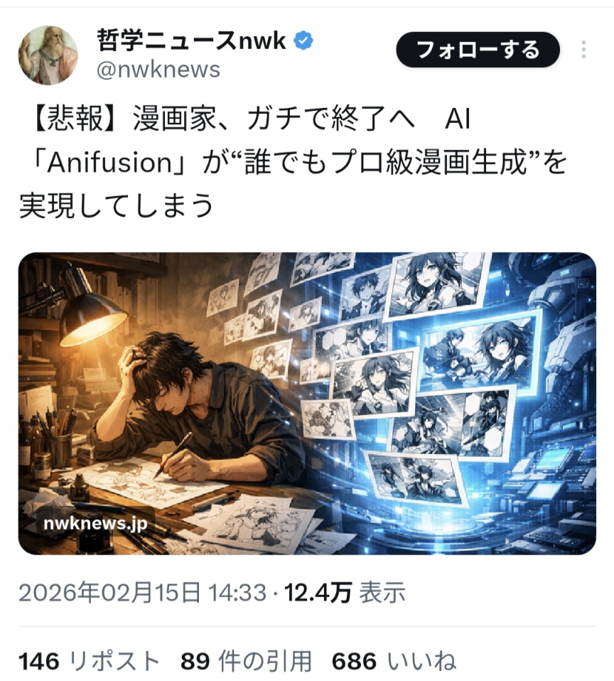AI技術で漫画家終了か削除された記事が3件あります.見る