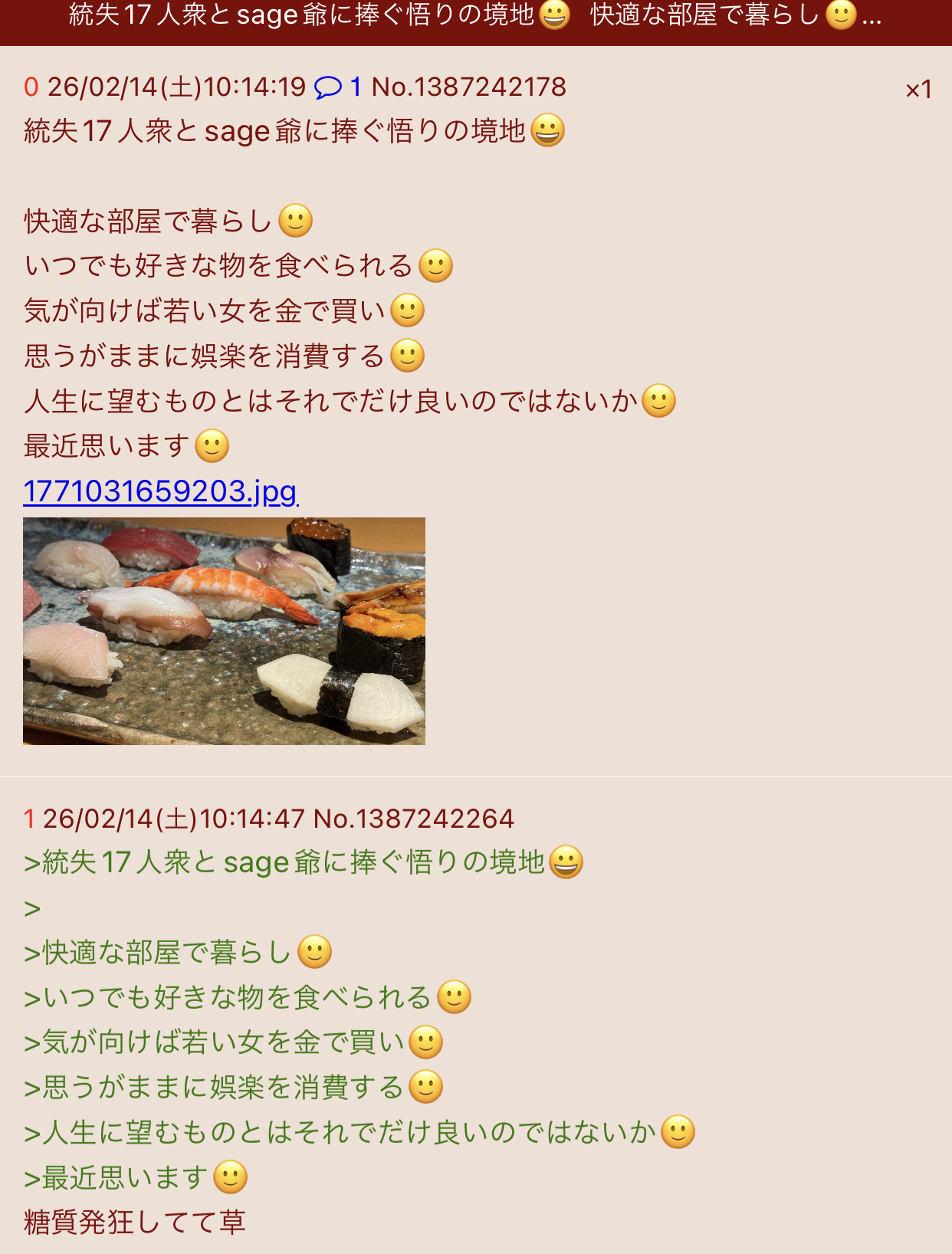 | … | 16無念Nameとしあき26/02/17(火)21:09:16No.1388120833そうだねx2こんな寿司画像で何回もクソスレ立てる基地外が下痢便スレ豚以外にいるわけないだろ |