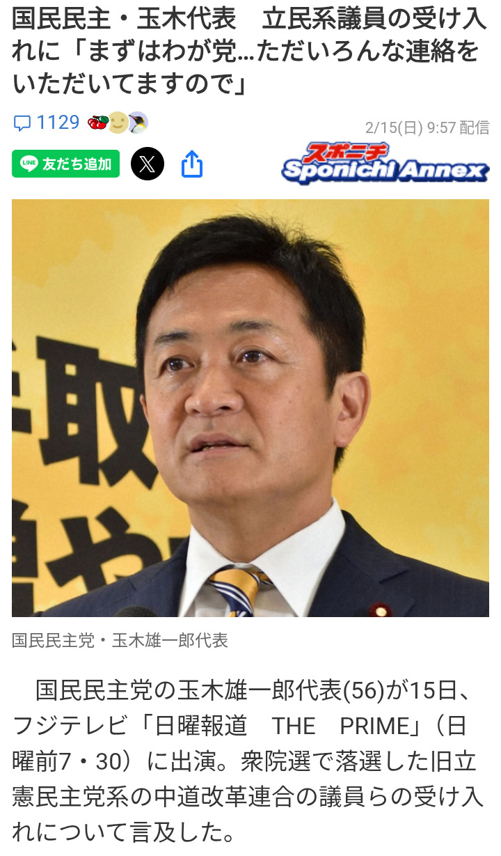 | … | 978無念Nameとしあき26/02/18(水)00:05:52No.1388166130+>>泉だけずっと玉木みたいな事言ってるけどもういい加減国民民主行けよ |