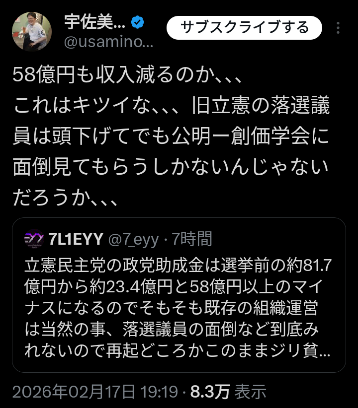 | … | 14無念Nameとしあき26/02/17(火)21:05:29No.1388119780そうだねx2公明とくっついて終了か…馬鹿だねぇ |