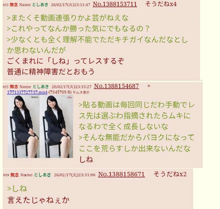| … | 917無念Nameとしあき26/02/17(火)23:38:29No.1388160439+荒らしの人に訊きたいのだけど |