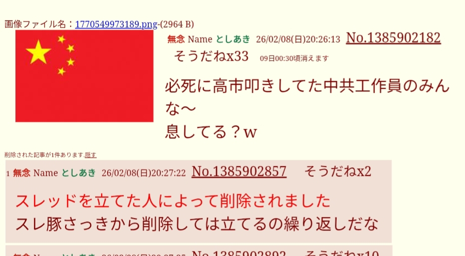 | … | 48無念Nameとしあき26/02/18(水)00:03:32No.1388165732+◆在留中国人殺害は正義である◆ |