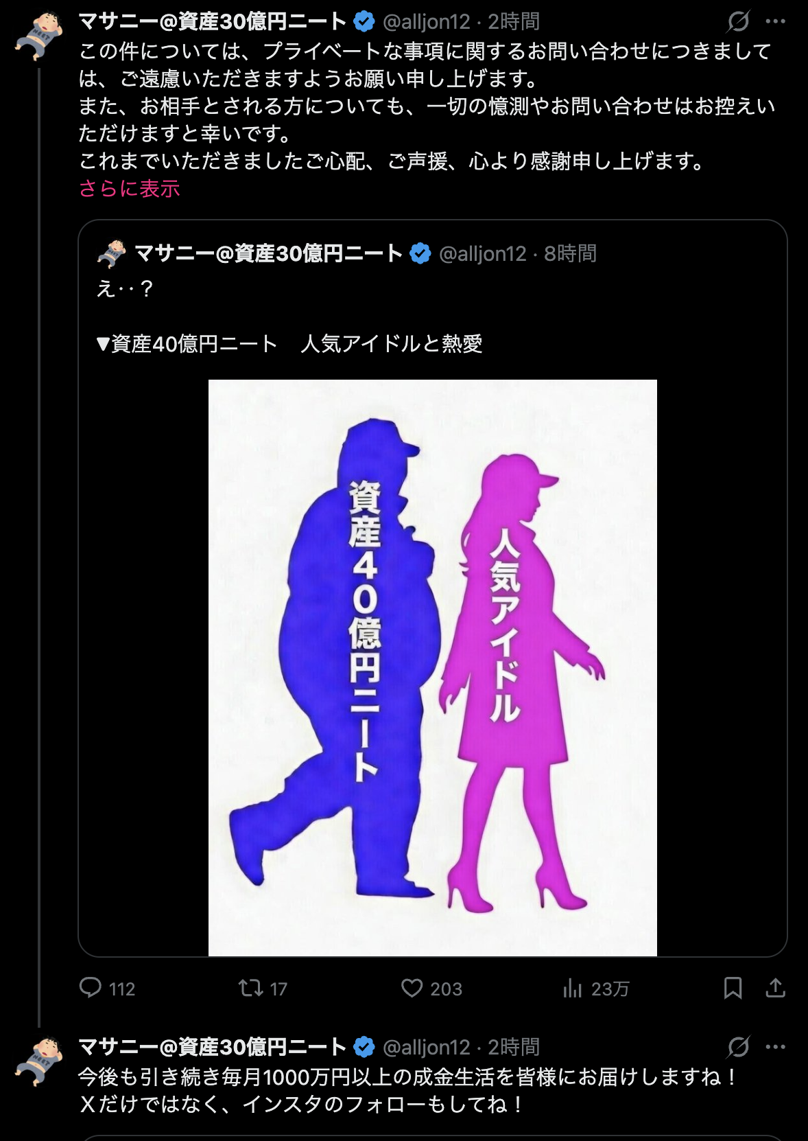 | … | 86無念Nameとしあき26/02/18(水)00:10:54No.1388167071そうだねx2>資産40億でもニート扱いかよ |