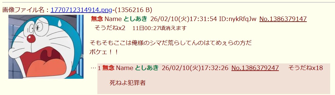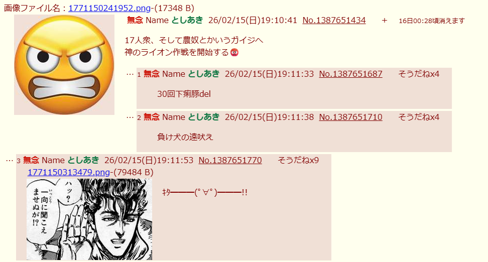 | … | 16無念Nameとしあき26/02/18(水)20:36:59No.1388320624そうだねx10また自分がここの王様気取りか |