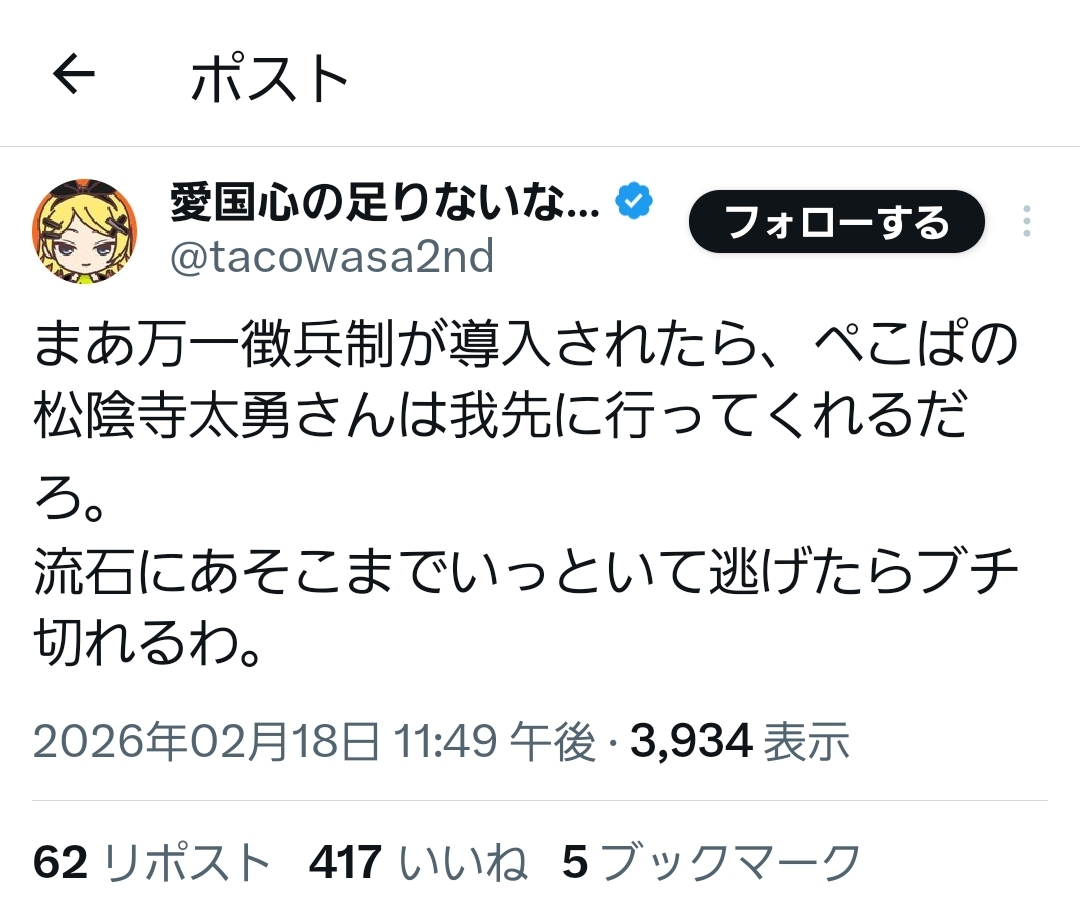 | … | 44無念Nameとしあき26/02/19(木)02:05:17No.1388391105+ネトウヨは右翼であって愛国ではないからな |