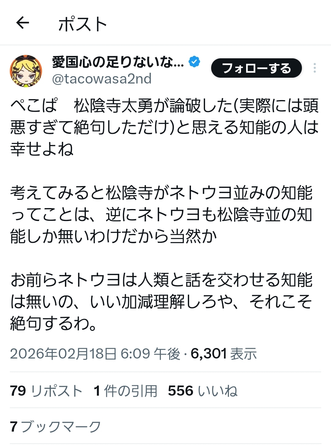 | … | 48無念Nameとしあき26/02/19(木)02:18:35No.1388391903+自己顕示欲の塊であえてアホなこと言ってるのか頭悪いかの2択なんだと思うけどどっちだろうね |