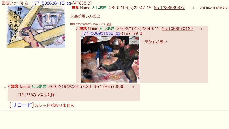 | … | 100無念Nameとしあき26/02/19(木)23:58:18No.1388586588+第三者侮辱罪で朝鮮送りだな |