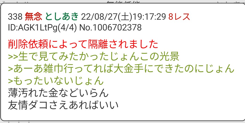 | … | 1無念Nameとしあき26/02/20(金)08:16:54 ID:YApXADKINo.1388622300そうだねx2 1771543014500.png-(284144 B) 削除依頼によって隔離されました |