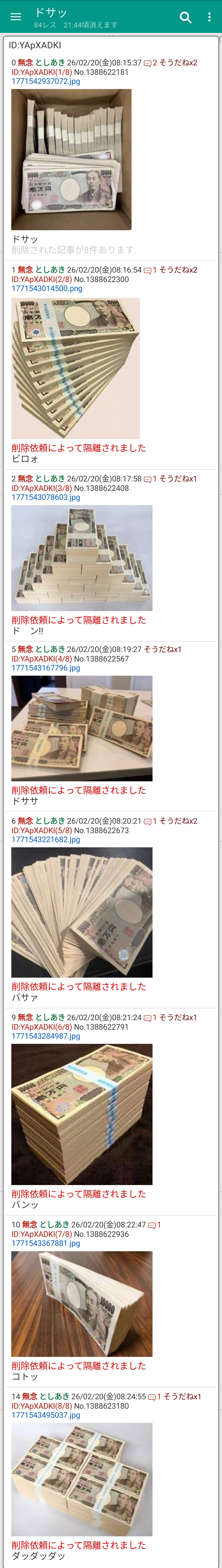 | … | 13無念Nameとしあき26/02/20(金)08:24:28No.1388623130そうだねx11自分のではない札束の画像保存するのが趣味なの? |