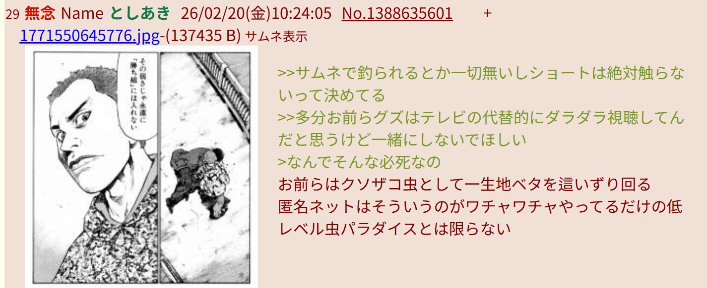 | … | 172無念Nameとしあき26/02/20(金)12:43:38No.1388656119+>>なら聞くが十数年生活保護で生きてる精スプクソデブ荒らしより下のやつなんているのかよ |