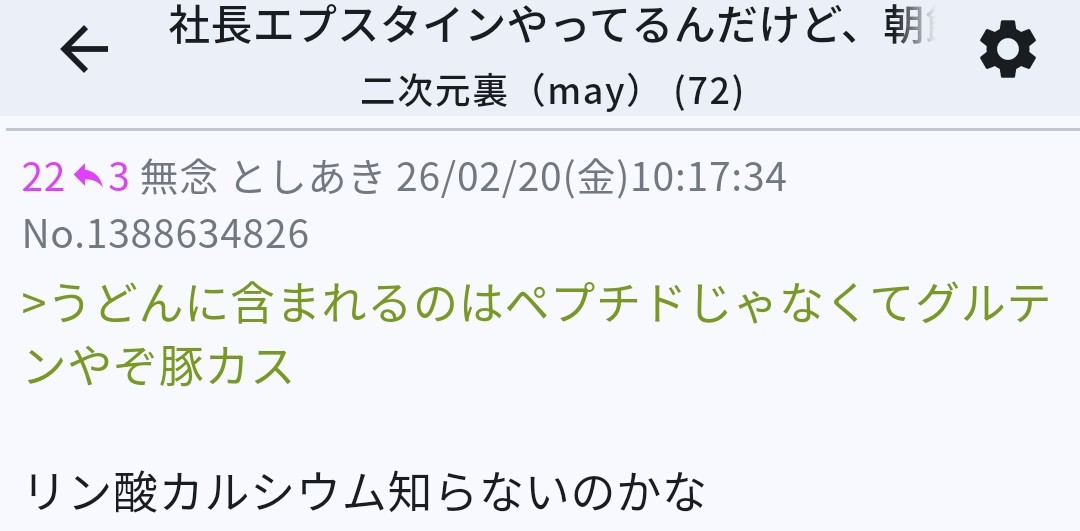 | … | 26無念Nameとしあき26/02/20(金)10:19:05No.1388635022そうだねx7>>うどんに含まれるのはペプチドじゃなくてグルテンやぞ豚カス |