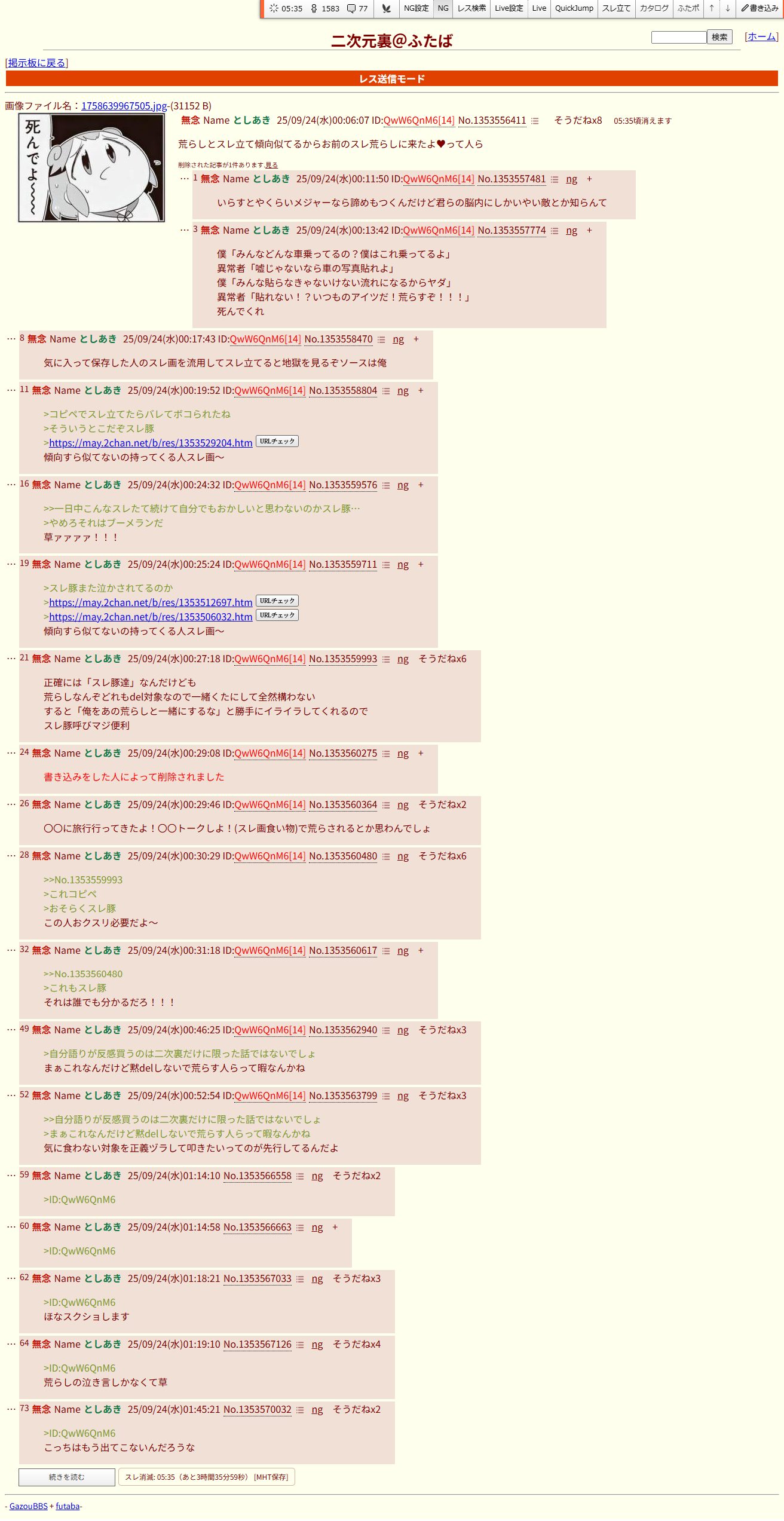 | … | 5無念Nameとしあき26/02/20(金)10:13:04No.1388634277+一回ブヒッと鳴く都度新しいクソスレを立てないで |