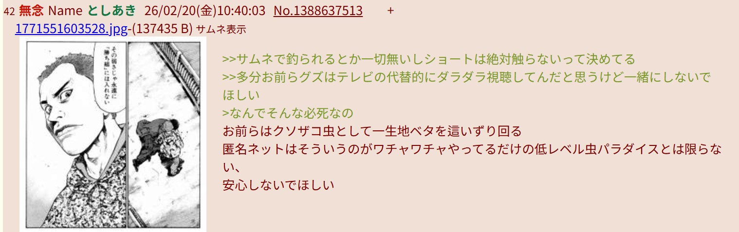 | … | 58無念Nameとしあき26/02/20(金)10:30:00No.1388636345+ 1771551000783.jpg-(178530 B) >あちこちのスレで頭悪い子のレスが怒り狂って |