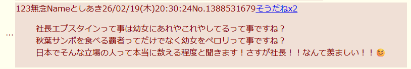 | … | 134無念Nameとしあき26/02/20(金)11:51:58No.1388646592+豚ヤッチャイがエプスタイン関わってるそうなんでニュースサイトにタレこんどいたよ |